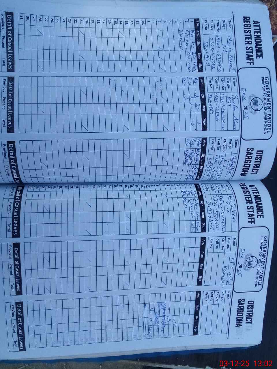 | CNIC | Full Name | Designation | R/C | Absence during last cal. month |