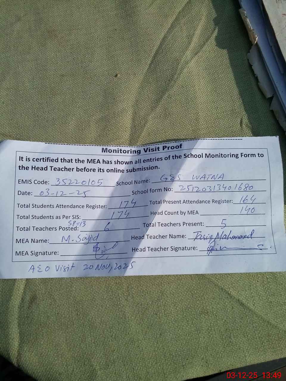 | Attendance Register | Head Teacher | MEA with School | Visit Proof |