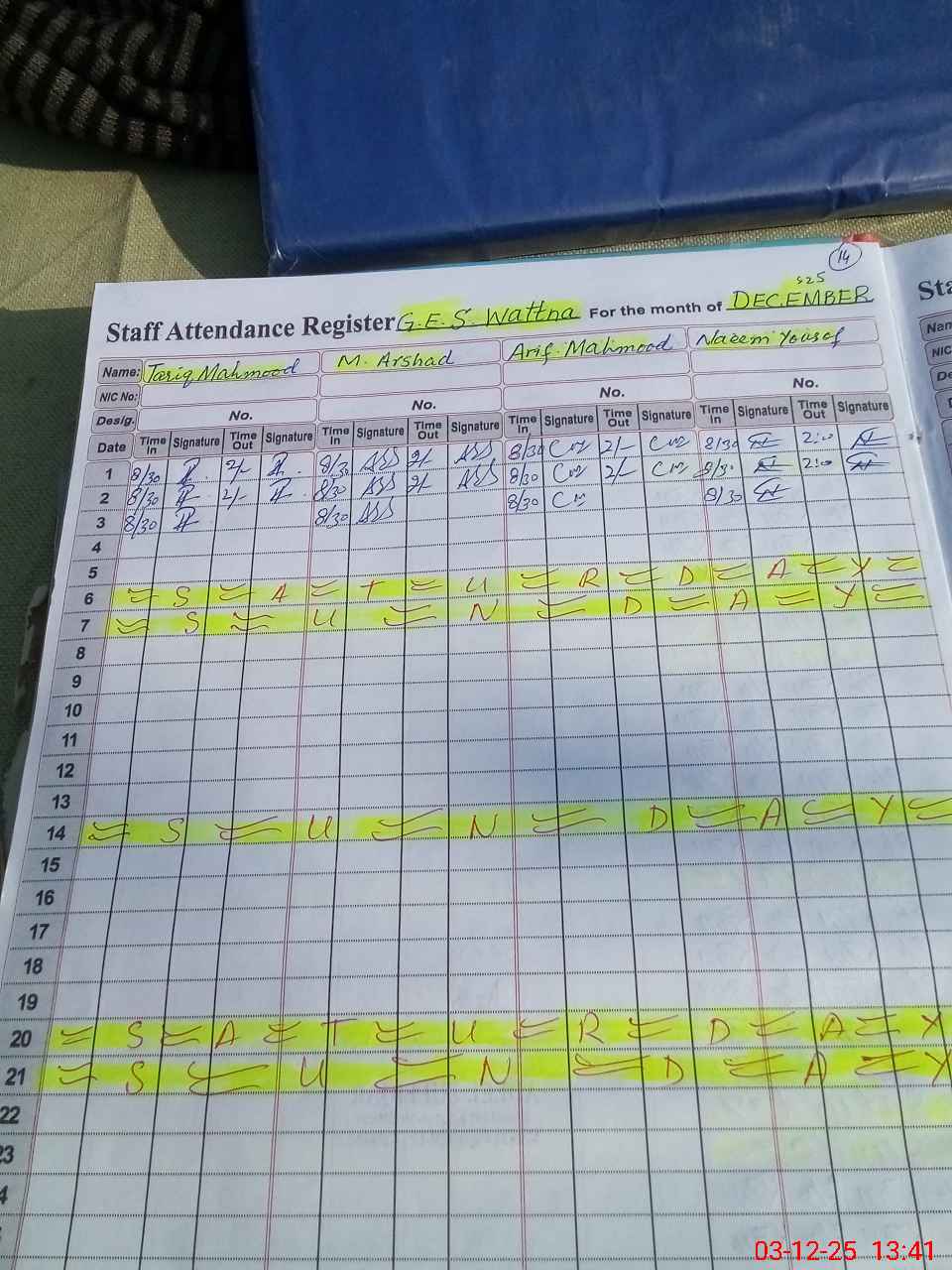 | CNIC | Full Name | Designation | R/C | Absence During Last Calender Month |