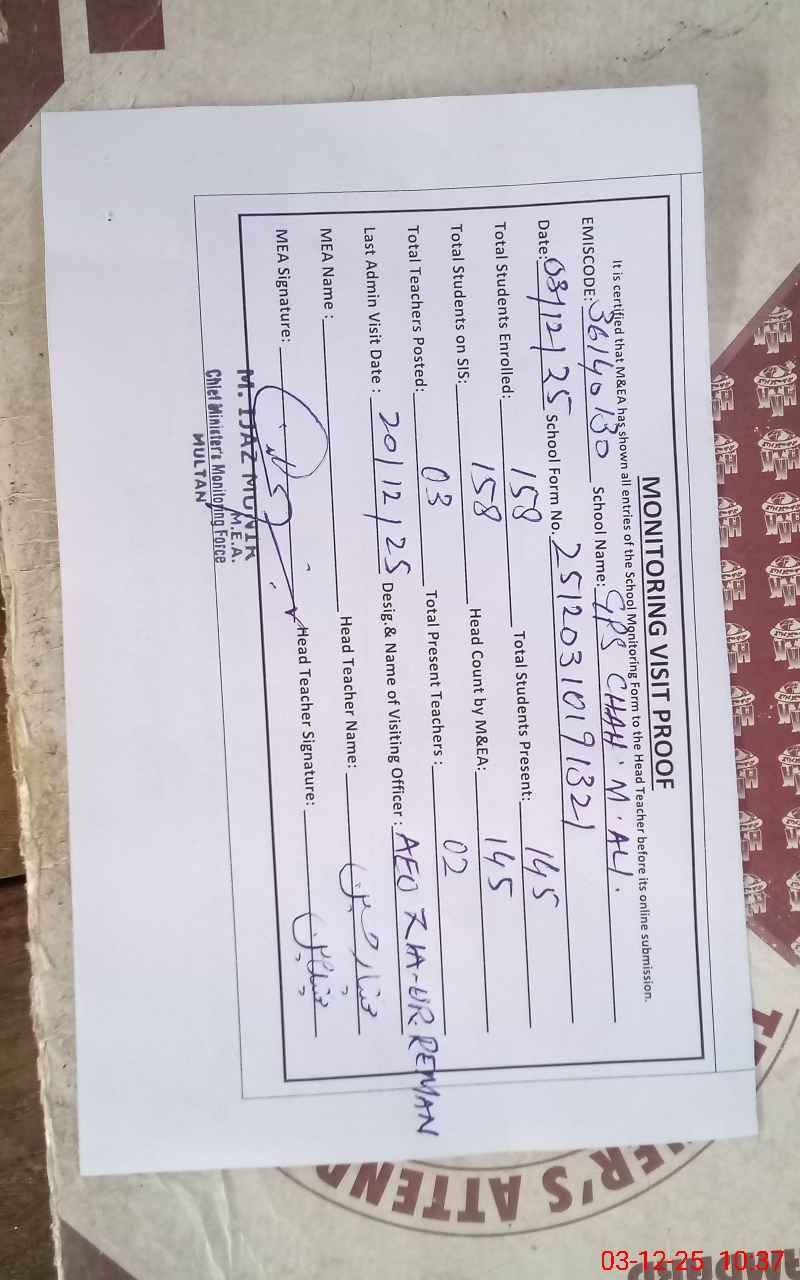 | EMIS Code: 36140130 | Name of School: GPS CHAH MUHAMMAD ALI WALA | |||