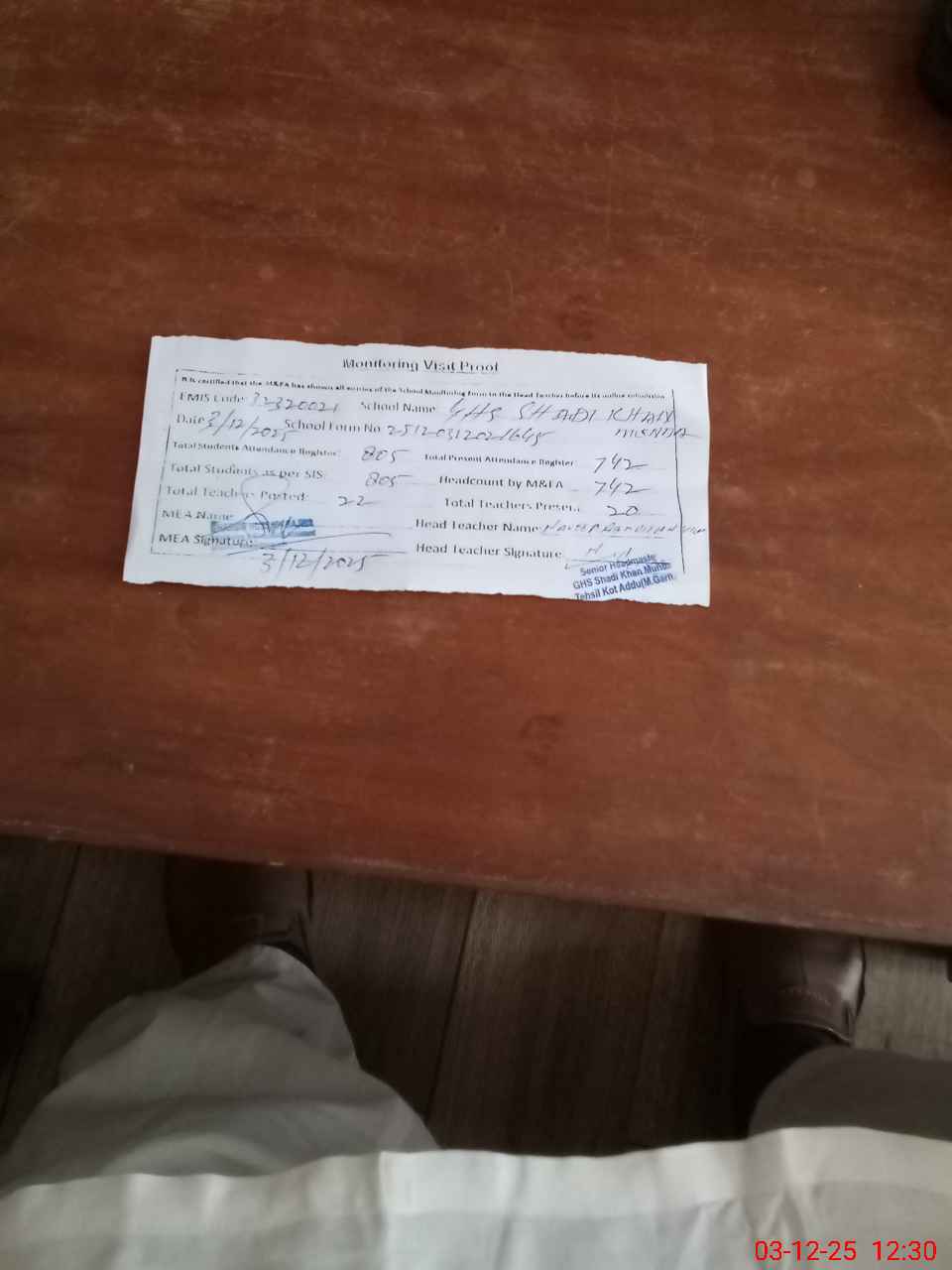 | EMIS Code: 32320021 | Name of School: GHS SHADI KHAN MUNDA | |||