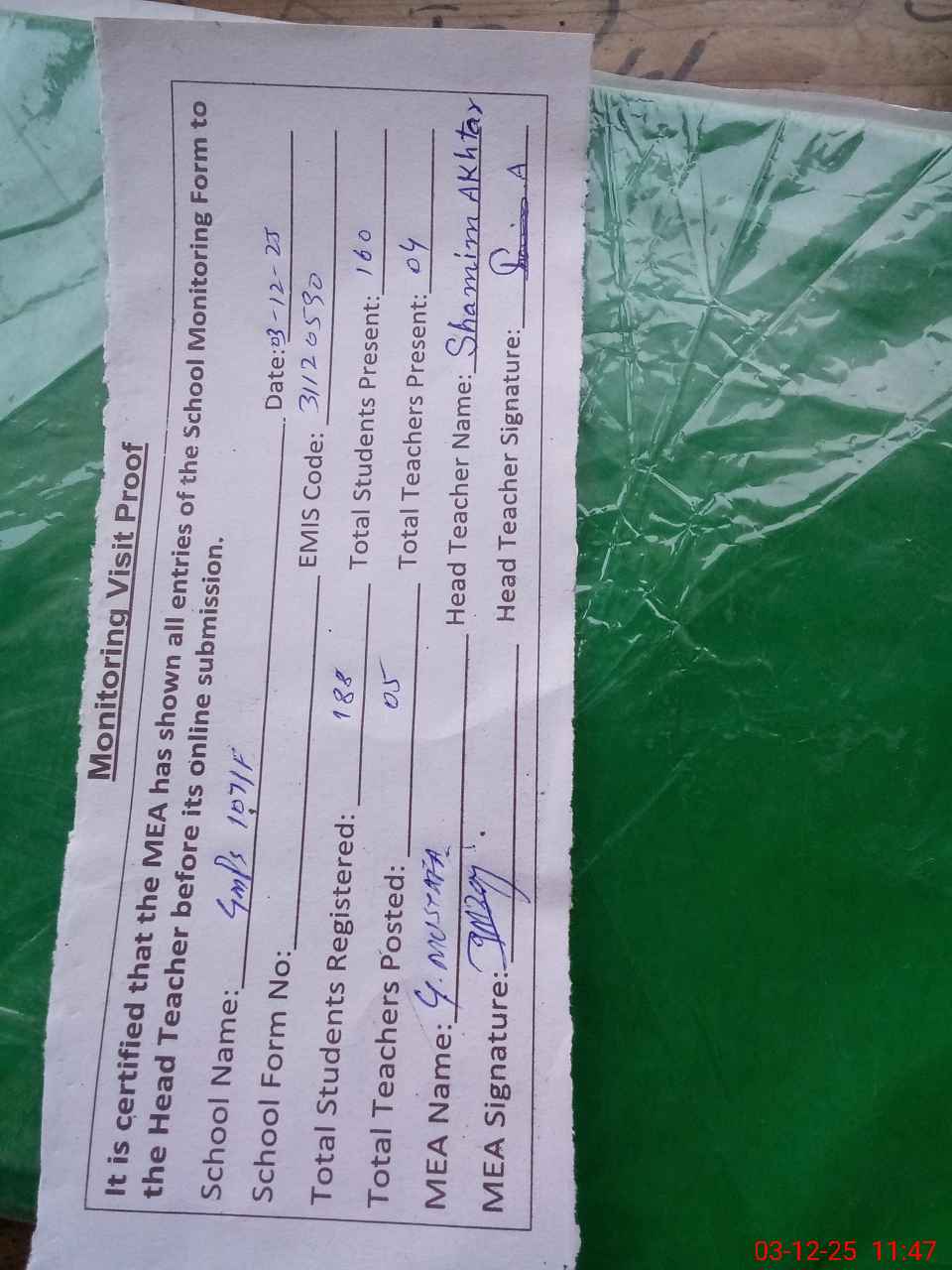 | Attendance Register | Head Teacher | MEA with School | Visit Proof |