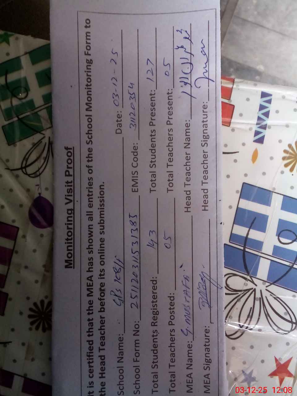 | Name: MU**** Im**** Designation: (School Headmaster's/Headmistress's) ESt Phone/Cell Number: 03**** |