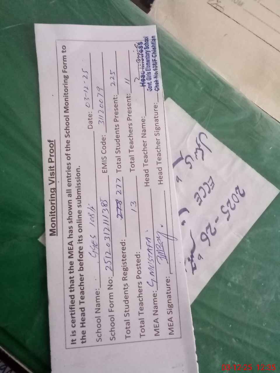 | Attendance Register | Head Teacher | MEA with School | Visit Proof |