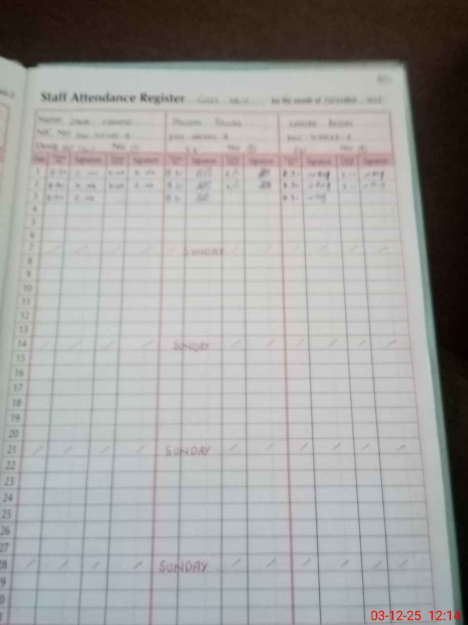 | CNIC | Full Name | Designation | R/C | Absence During Last Calender Month |