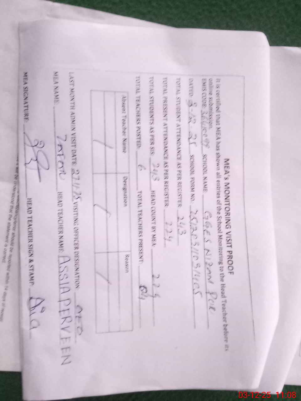 | Attendance Register | Head Teacher | MEA with School | Visit Proof |