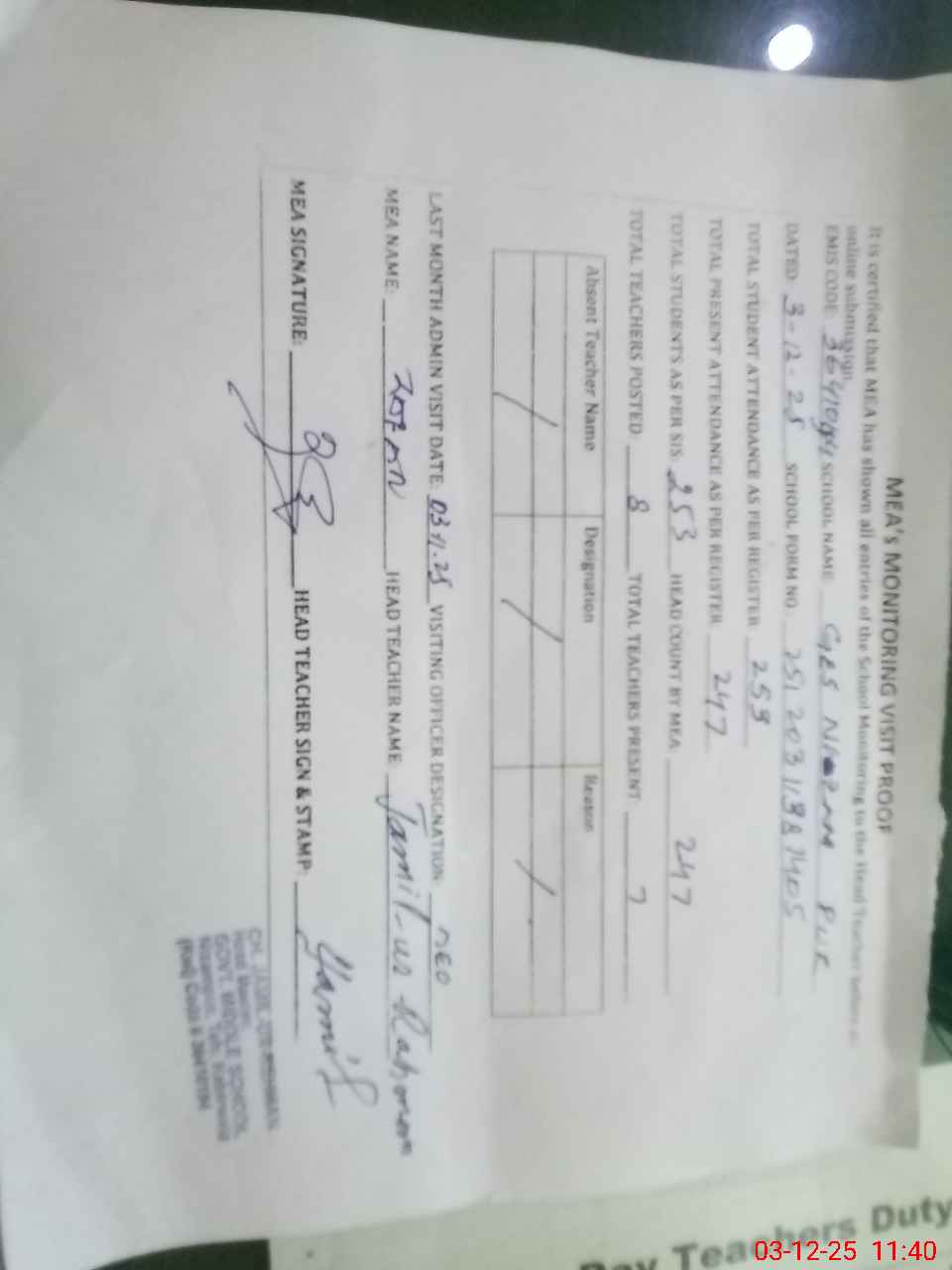 | Attendance Register | Head Teacher | MEA with School | Visit Proof |