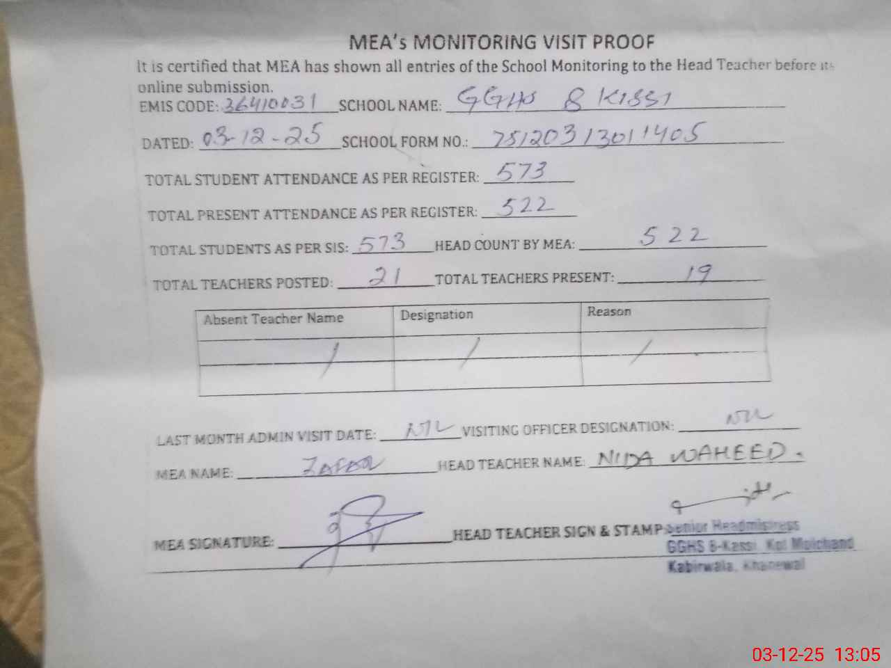 | EMIS Code: 36410031 | Name of School: GGHS 8-KASSI, KOT MULCHAND, KABIRWALA | |||