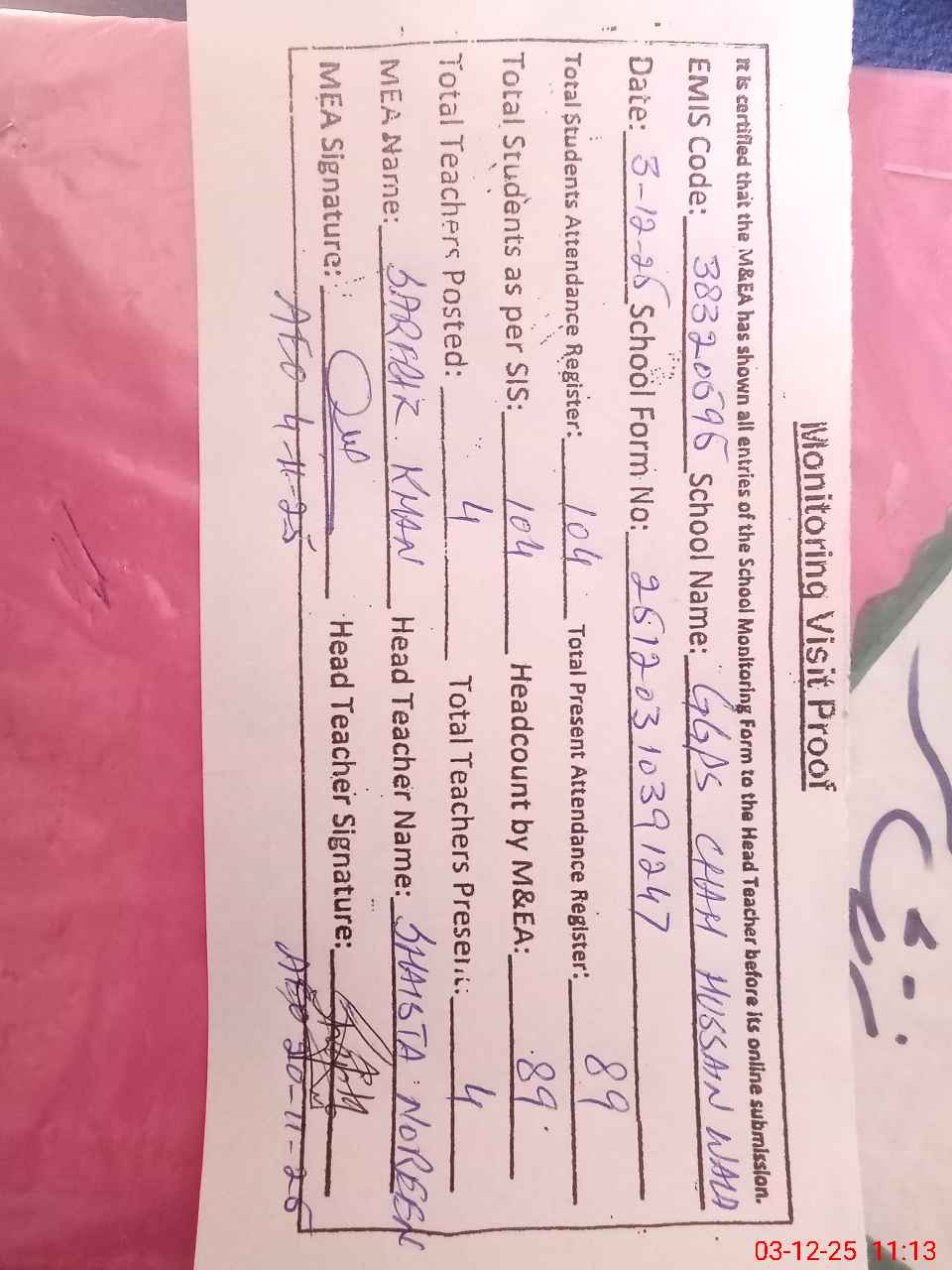 | EMIS Code: 38320595 | Name of School: GGPS CHAH HUSSAIN WALA | |||