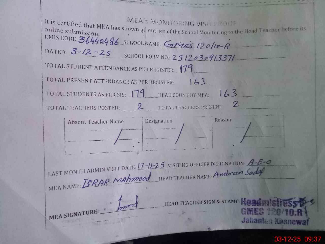 | Attendance Register | Head Teacher | MEA with School | Visit Proof |