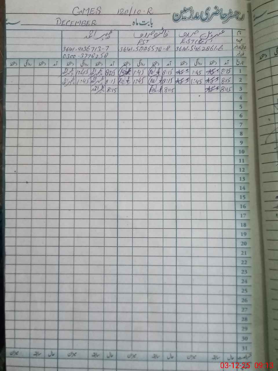 | CNIC | Full Name | Designation | R/C | Absence During Last Calender Month |
