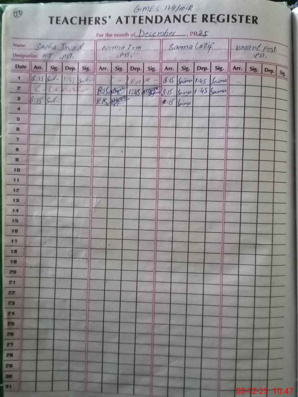 | CNIC | Full Name | Designation | R/C | Absence During Last Calender Month |