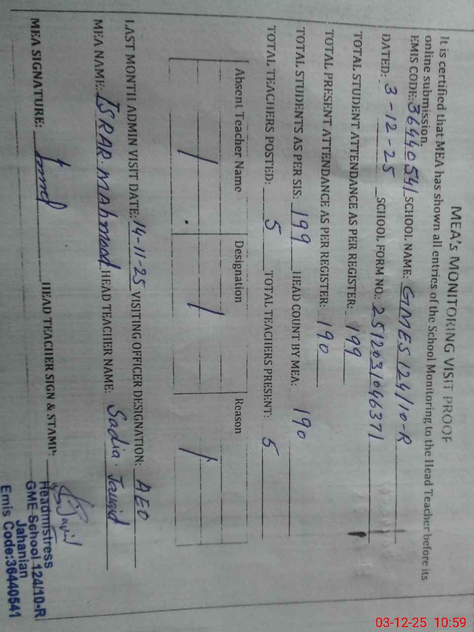| Attendance Register | Head Teacher | MEA with School | Visit Proof |