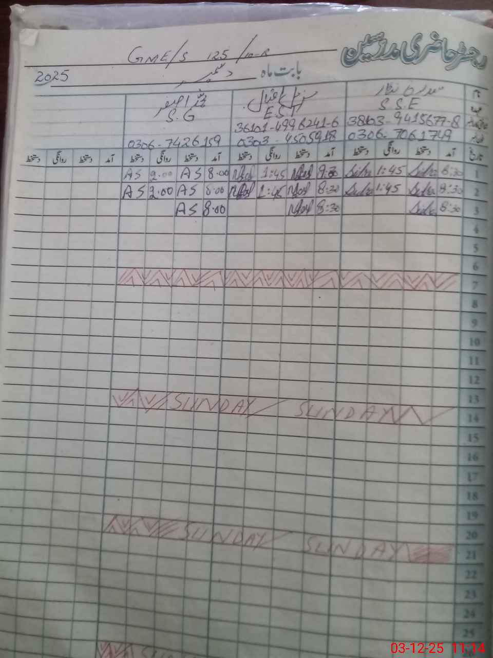 | CNIC | Full Name | Designation | R/C | Absence During Last Calender Month |