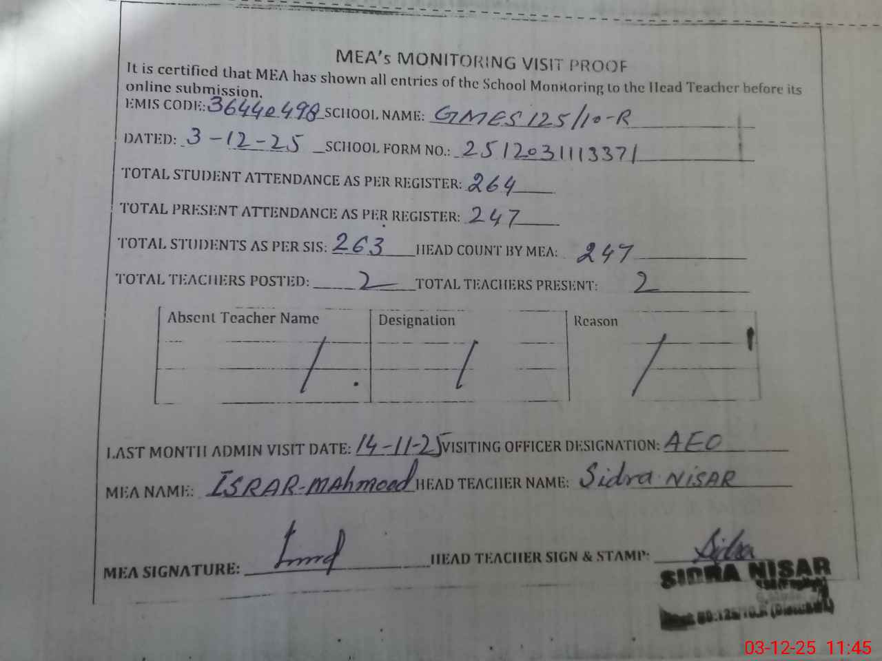 | Attendance Register | Head Teacher | MEA with School | Visit Proof |