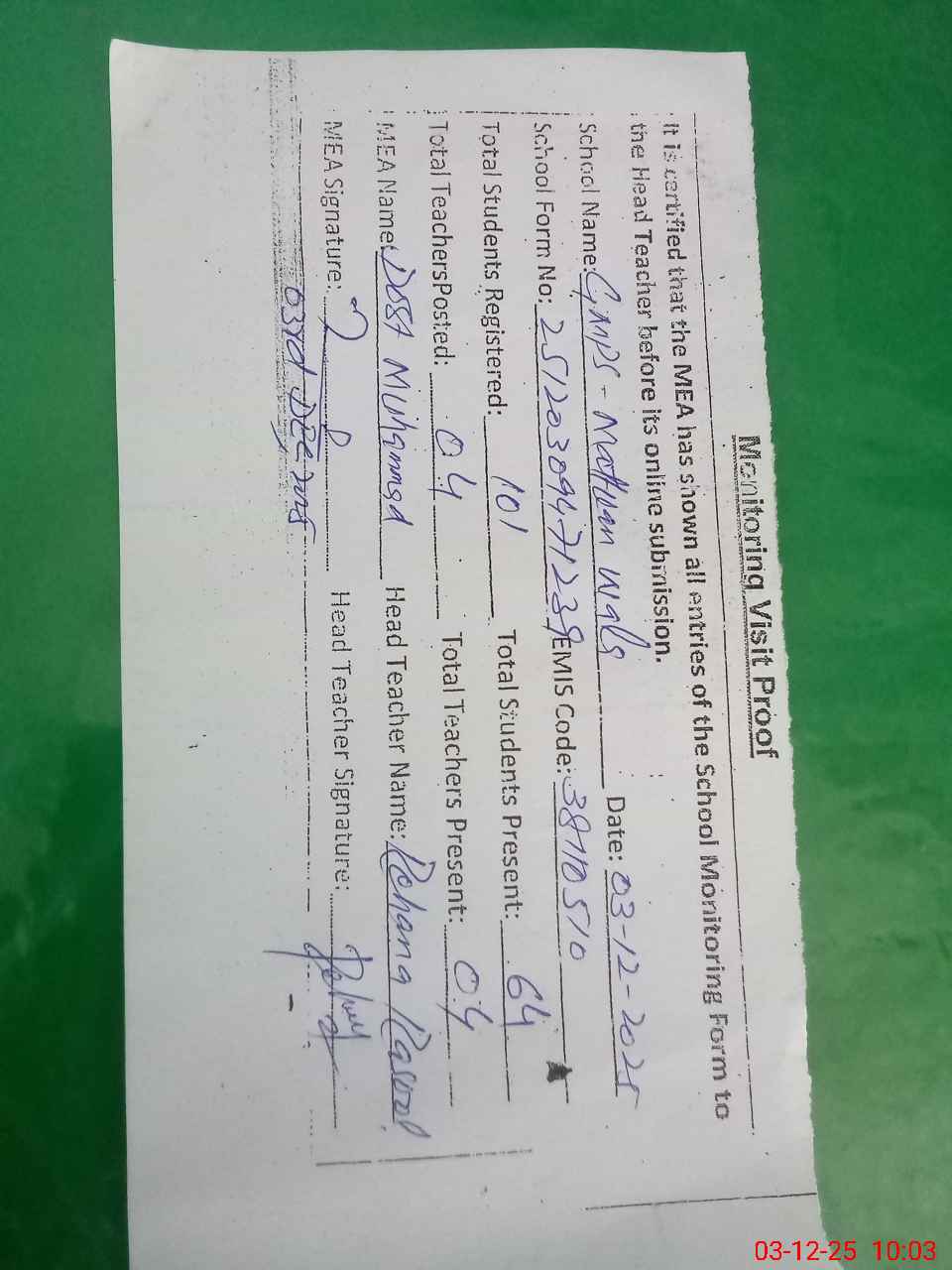 | Monitoring Date: 03-12-2025 | Start Time: 03-12-2025 09:19 AM | End Time: 03-12-2025 10:08 AM | Name of MEA: Do**** Mu**** | |