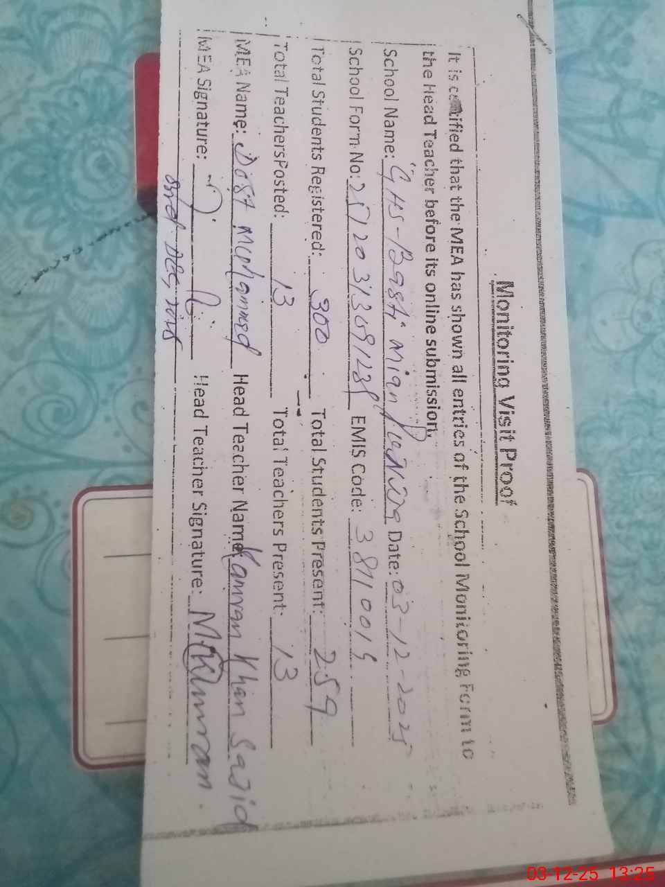 | Remarks (Use Separate Page if Required): All the entered data loudly share with the head teacher before submitting Last visited the subject school by Educational Authority Munir Aoulakh DEO SECONDARY 22nd November 2025 | |||||