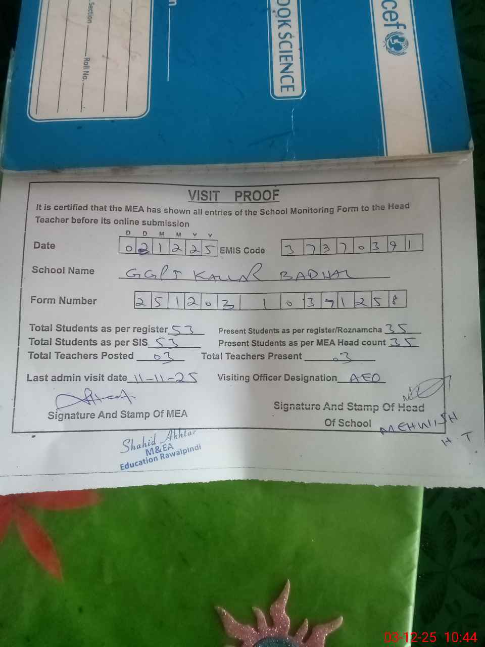 | Attendance Register | Head Teacher | MEA with School | Visit Proof |