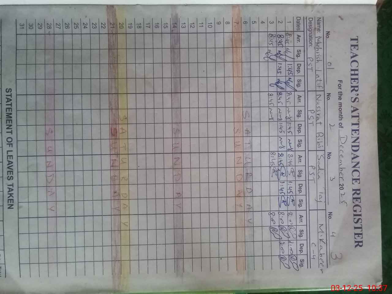 | CNIC | Full Name | Designation | R/C | Absence During Last Calender Month |