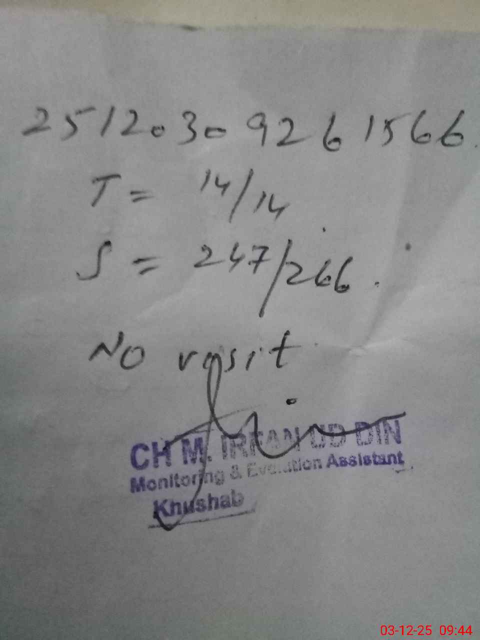 | Remarks (Use Separate Page if Required): ghs mardwal student on sis 266 student on register 266 head count 247 no teacher absent no visit in last month | |||||