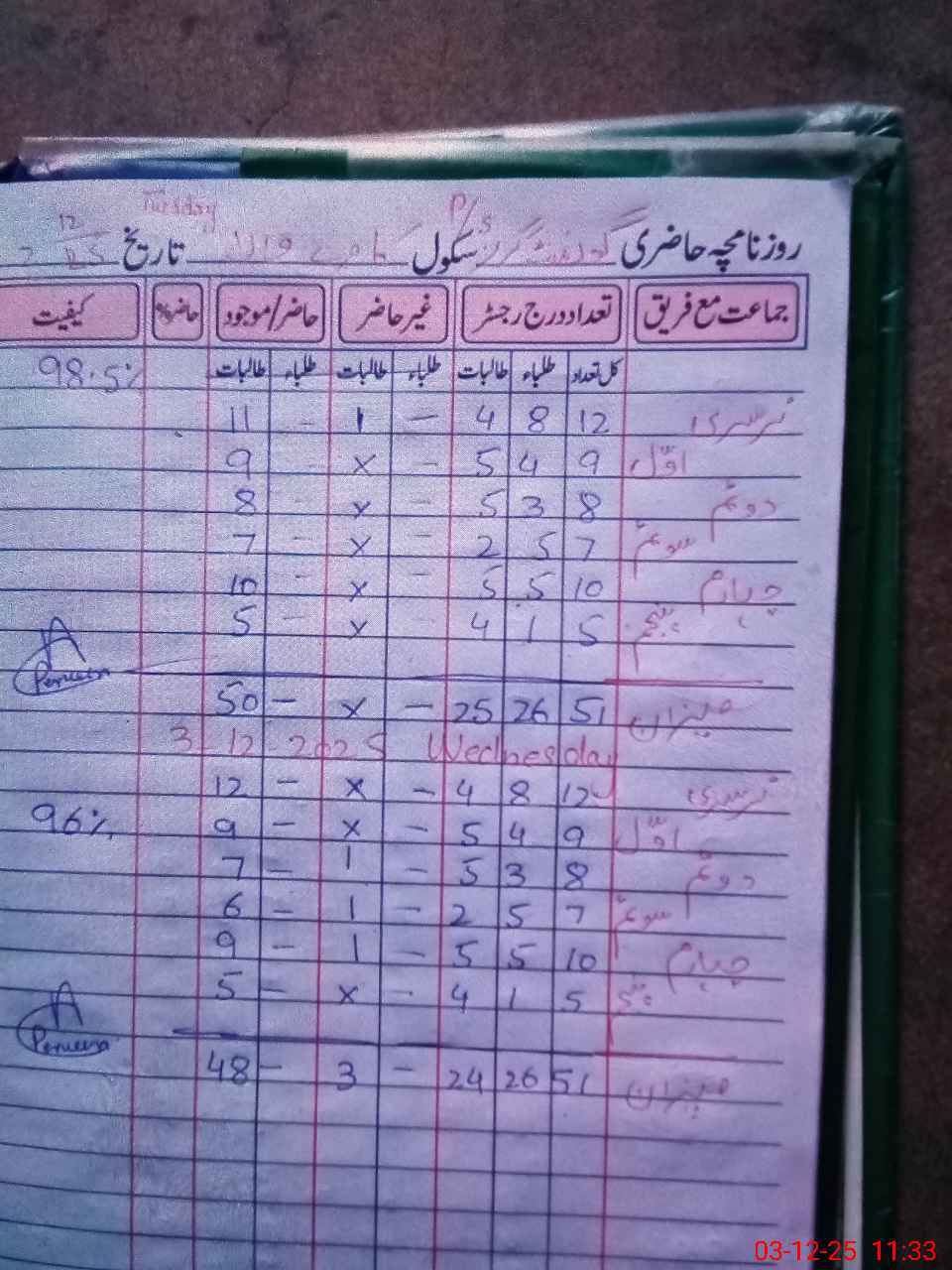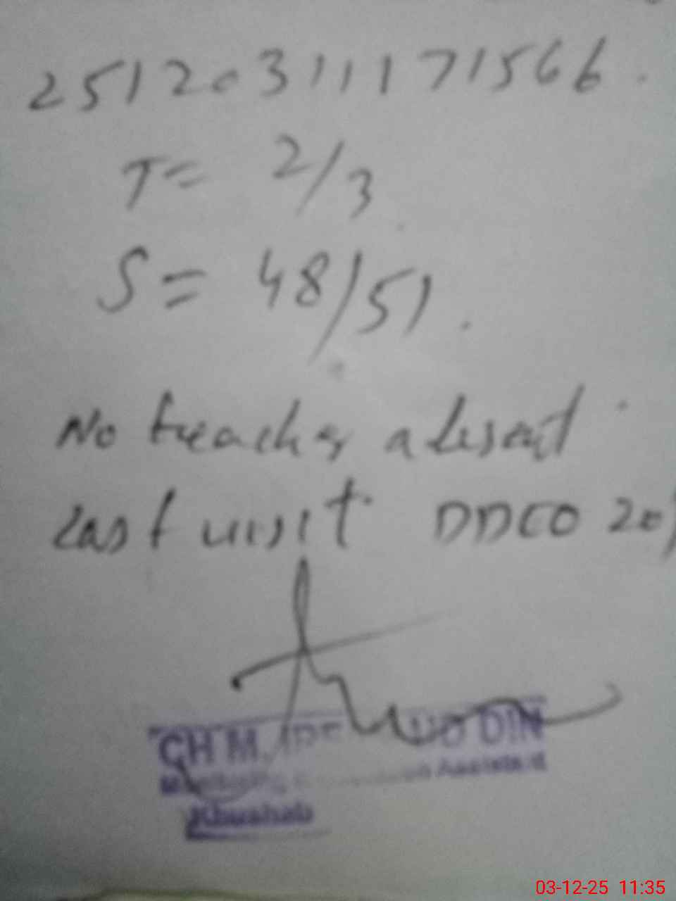 | Remarks (Use Separate Page if Required): ggps kamray wala student on sis 51 student on register 51 head count 48 no teacher absent one on mt leave last visit DEO 20/11/2025 water boring is not working so water issue exists nsb fund is very low need increase in nsb class room required repairing work in school needed | |||||