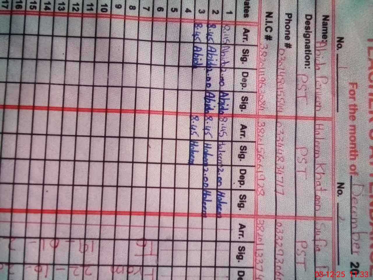 | CNIC | Full Name | Designation | R/C | Absence During Last Calender Month |