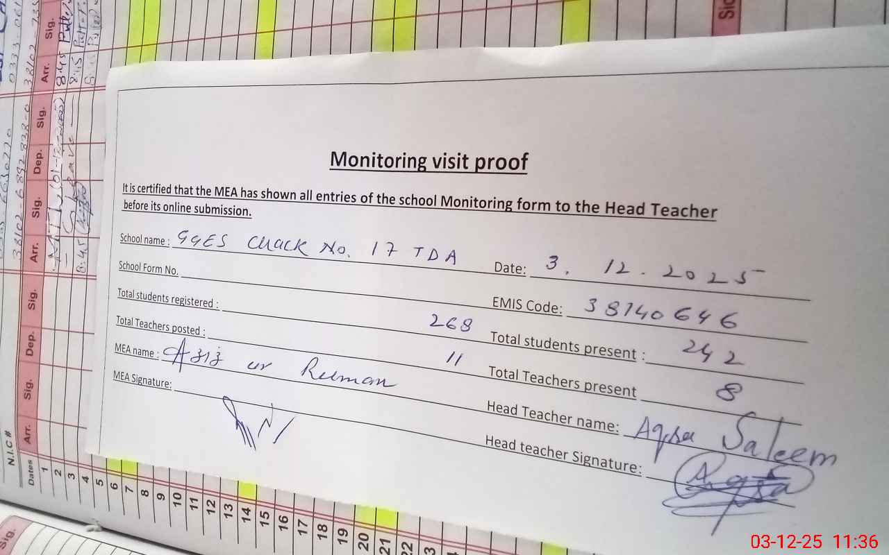 | Attendance Register | Head Teacher | MEA with School | Visit Proof |