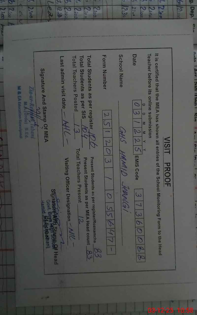 | EMIS Code: 37360088 | Name of School: GHS HAMID JHANGI | |||