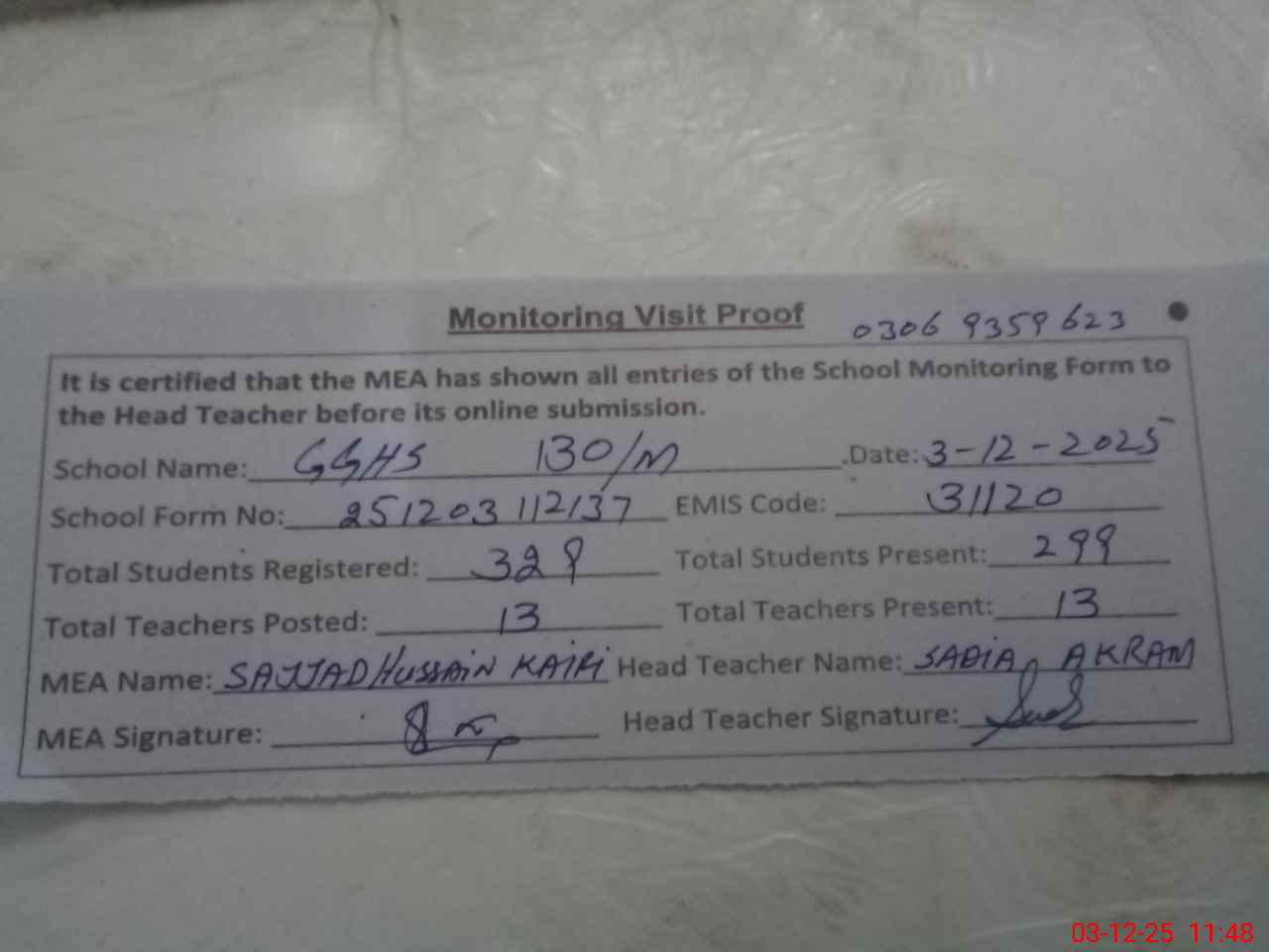 | EMIS Code: 31120045 | Name of School: GGHS CHAK NO. 130 M | |||