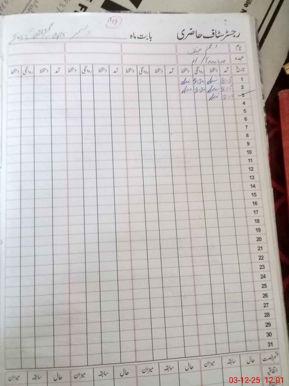 | CNIC | Full Name | Designation | R/C | Absence During Last Calender Month |
