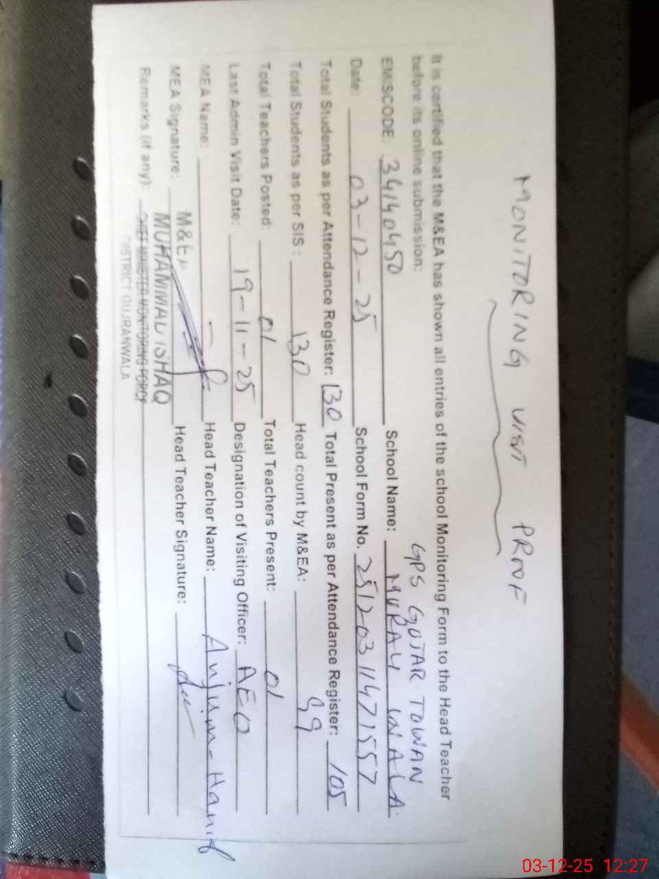 | Attendance Register | Head Teacher | MEA with School | Visit Proof |