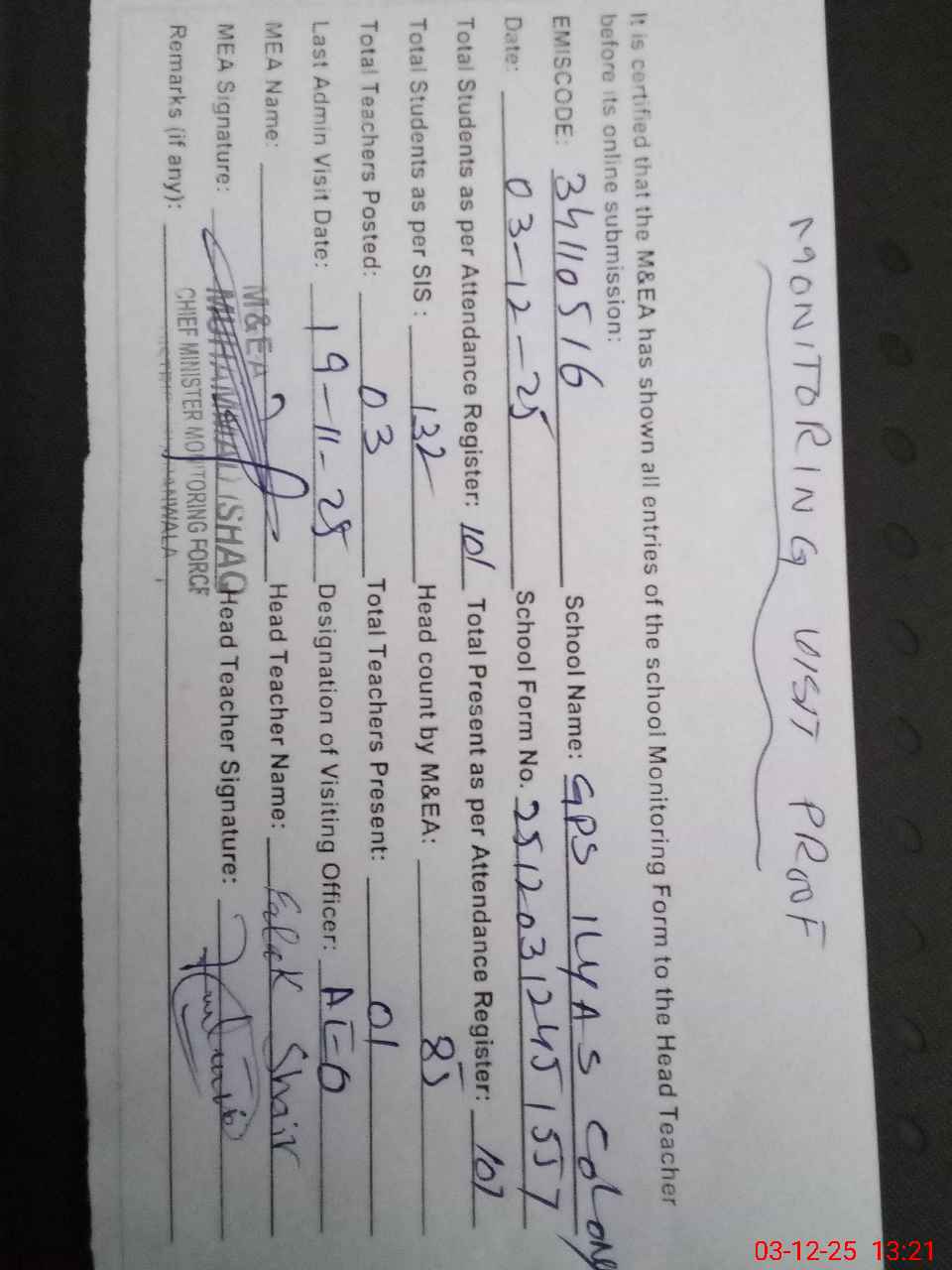 | EMIS Code: 34110516 | Name of School: GPS ILYAS COLONY | |||