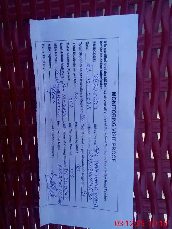 | EMIS Code: 38220022 | Name of School: GPS DERA HAMID WALA | |||