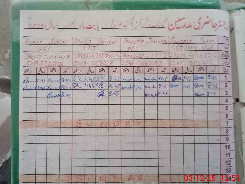| Name: SU**** IR**** Designation: (School Headmaster's/Headmistress's) SST(PHY.MATH Phone/Cell Number: 03**** |
