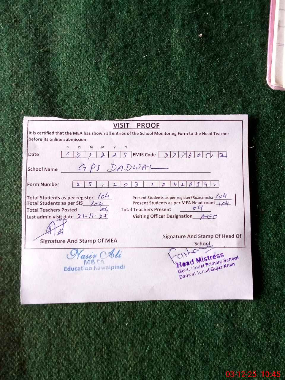 | EMIS Code: 37360512 | Name of School: GGPS DADWAL | |||