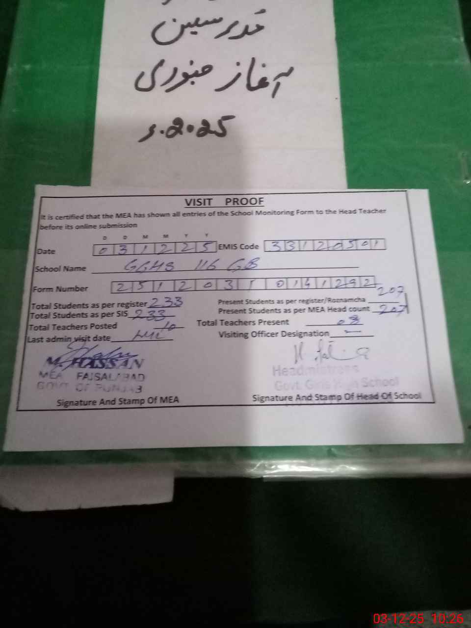 | EMIS Code: 33120501 | Name of School: GGHS CHAK 116 GB SATIANA | |||
