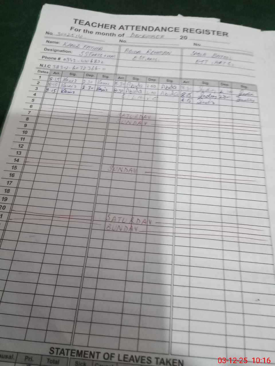 | Name: KA**** FA**** Designation: (School Headmaster's/Headmistress's) S.S.T.(ARTS) Phone/Cell Number: 03**** |