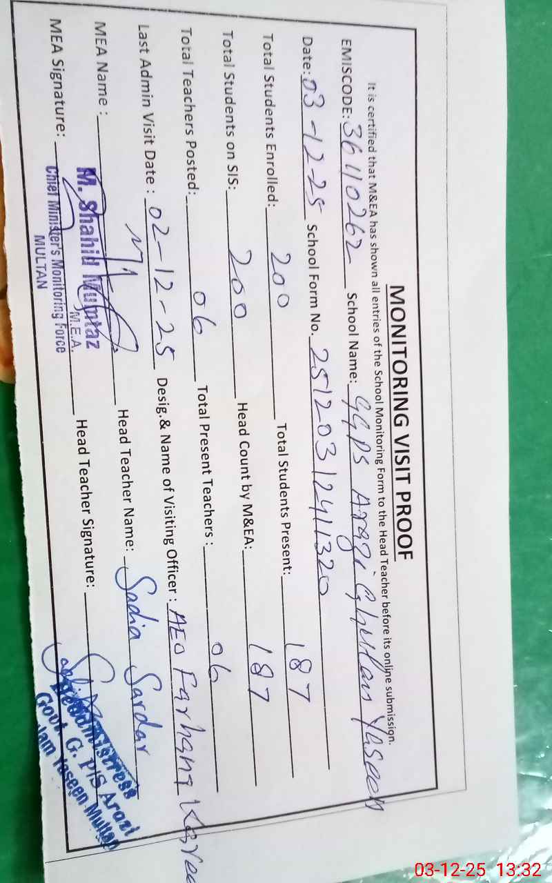 | EMIS Code: 36110262 | Name of School: GGPS ARAZI GHULAM YASIN DUNYA PUR ROAD MULTAN | |||