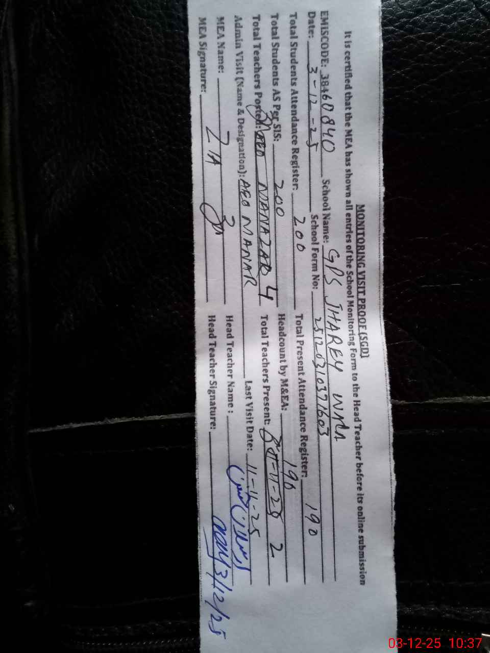 | Attendance Register | Head Teacher | MEA with School | Visit Proof |
