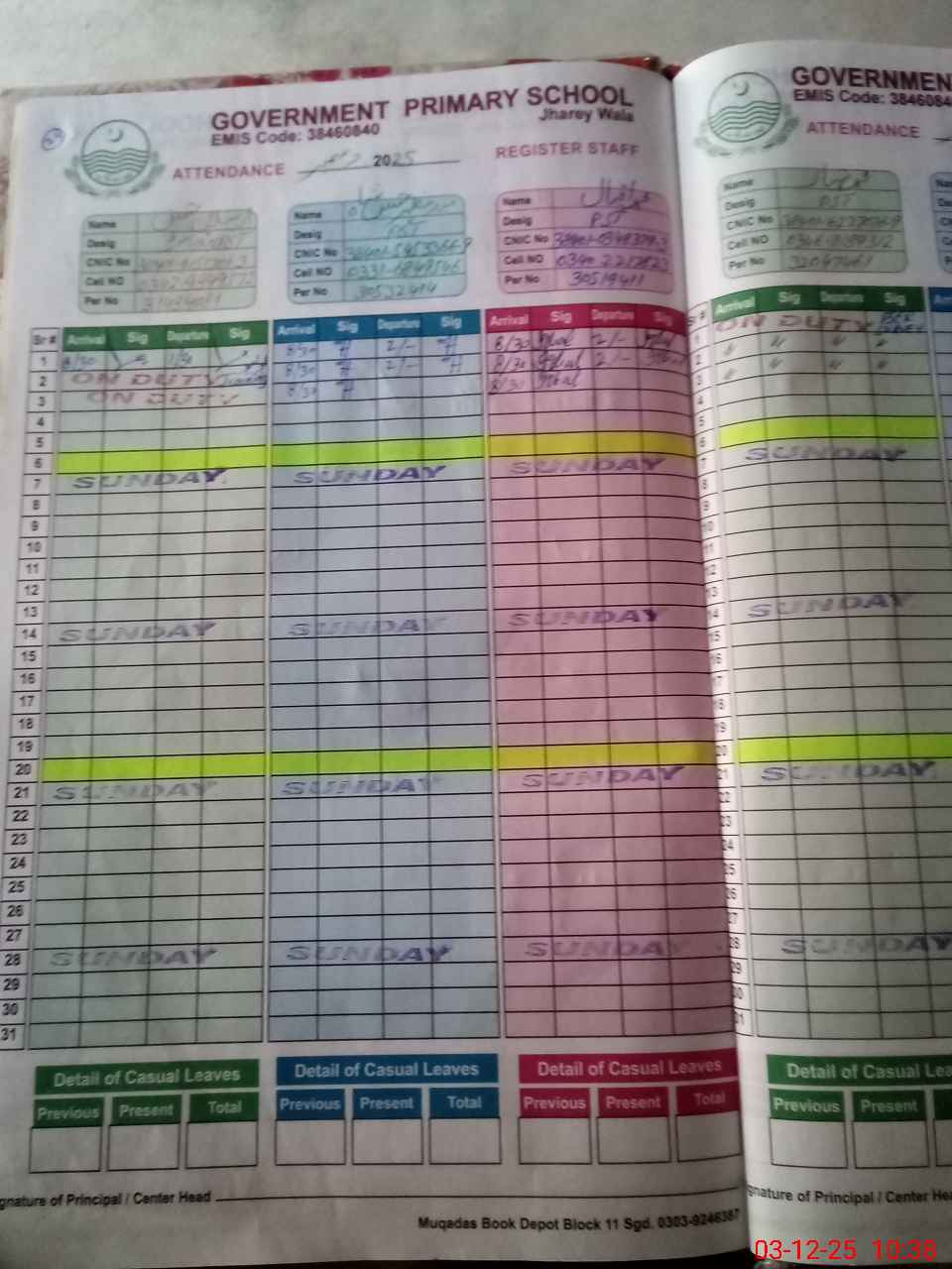 | CNIC | Full Name | Designation | R/C | Absence during last cal. month |