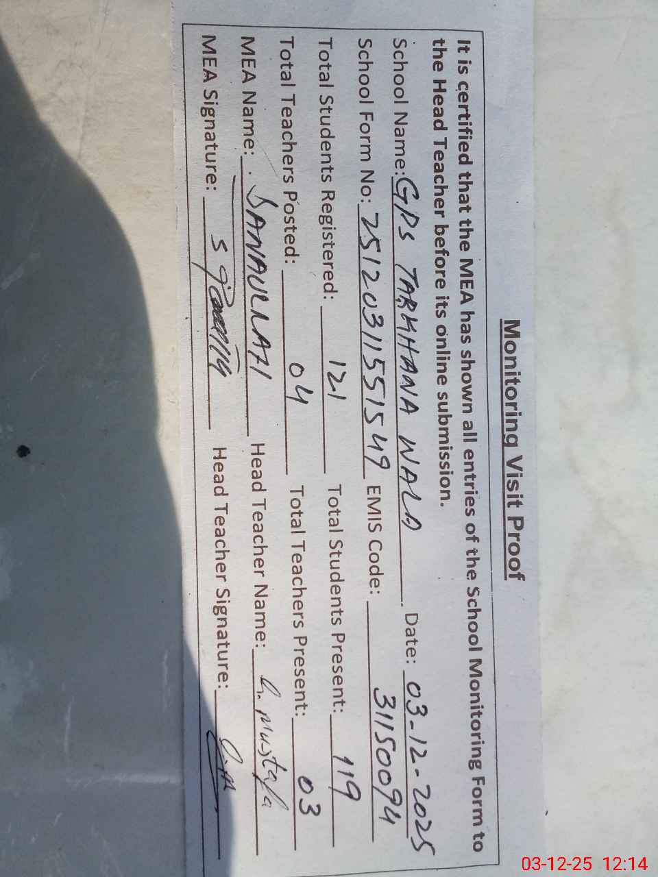 | Attendance Register | Head Teacher | MEA with School | Visit Proof |