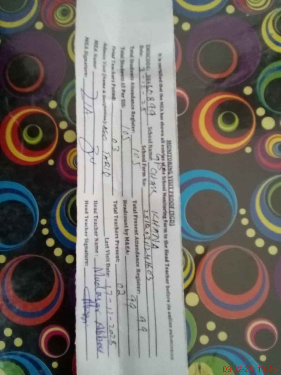 | Attendance Register | Head Teacher | MEA with School | Visit Proof |