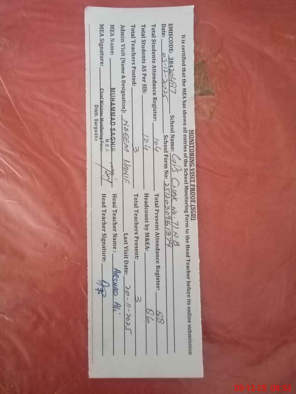 | Attendance Register | Head Teacher | MEA with School | Visit Proof |