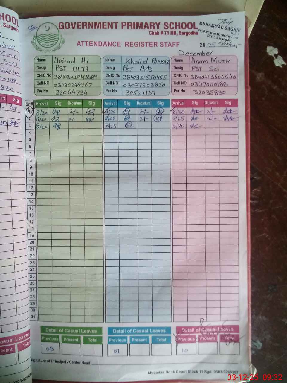 | CNIC | Full Name | Designation | R/C | Absence during last cal. month |