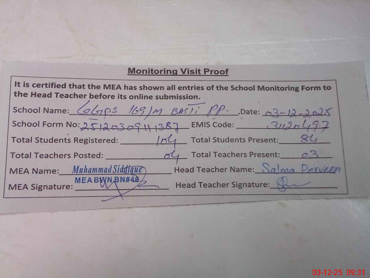 | Attendance Register | Head Teacher | MEA with School | Visit Proof |