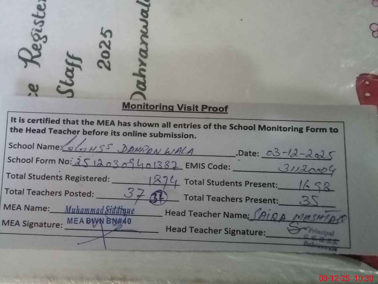 | EMIS Code: 31120004 | Name of School: GGHSS DAHRAN WALA | |||