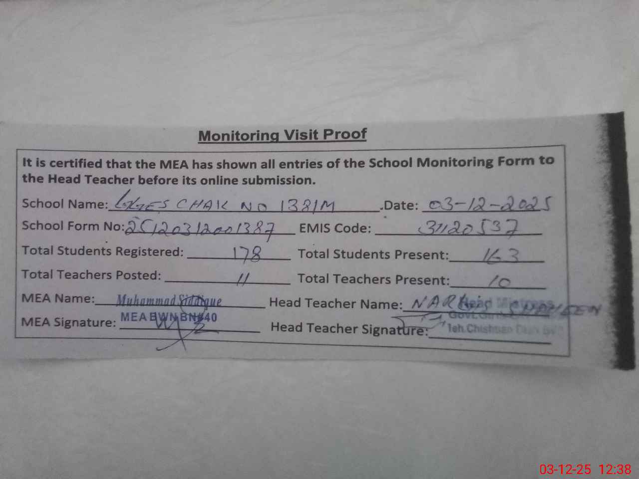 | Attendance Register | Head Teacher | MEA with School | Visit Proof |