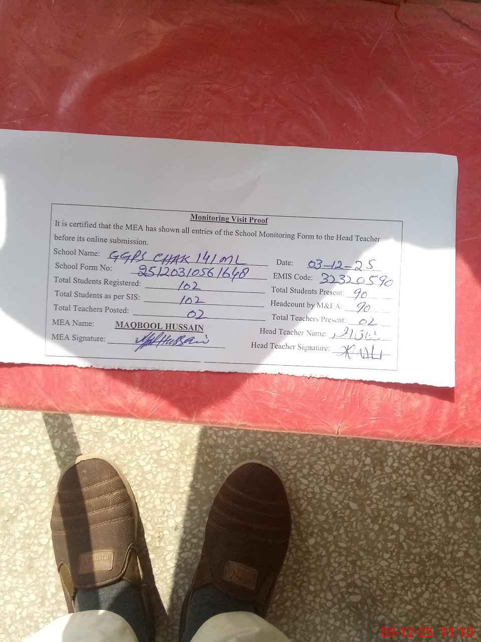 | Attendance Register | Head Teacher | MEA with School | Visit Proof |