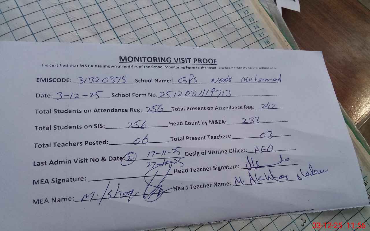 | EMIS Code: 31320375 | Name of School: GPS NOOR MUHAMMAD | |||