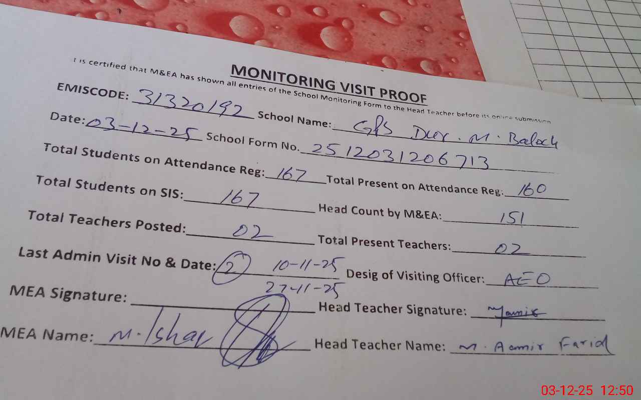 | Attendance Register | Head Teacher | MEA with School | Visit Proof |